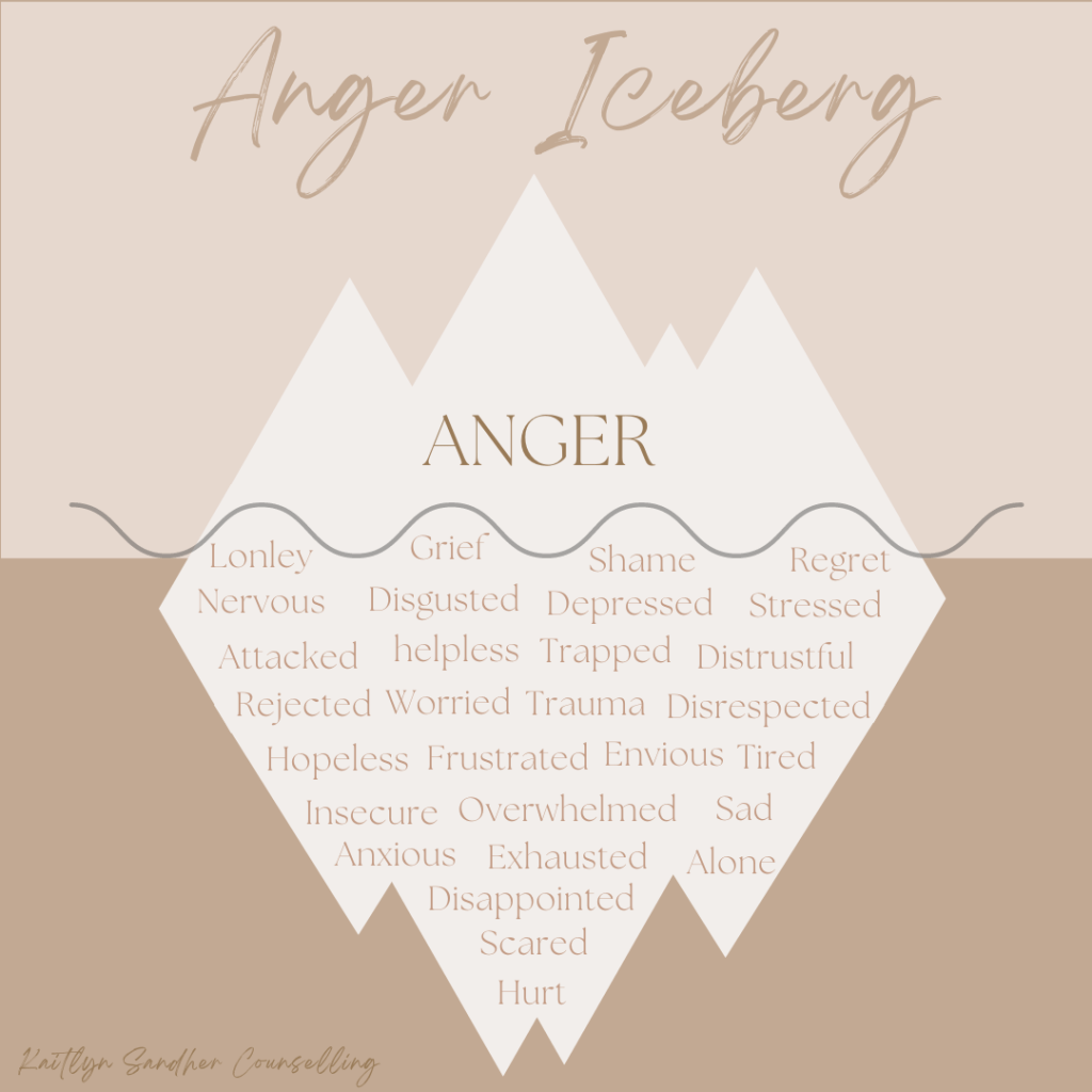 Let’s talk anger! The anger iceberg is a tool I use to help clients visualize anger. When you’re looking at an iceberg above water it can appear very small and simple- nothing much there; however, if you look below sea level, you realize there is much more beneath the surface. This is very much the same for anger! Human emotions are complex and unfortunately, we still don’t fully understand or completely agree on where they come from or how to classify them. That being said, researchers have come to believe that emotions can be classified as primary emotions or secondary emotions.